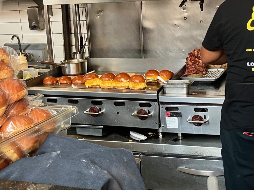 egg slut前の限られたテーブルが空いてなければ、Marketの中にはテーブルと椅子のスペースがたくさんあるのでそちらでいただけます。もし空いているなら一番のおすすめはegg slut 店内の5席ほどのカウンターです。今回ラッキーなことに偶然カウンターに座れたので、調理する人たちを眺めながら頂きました。